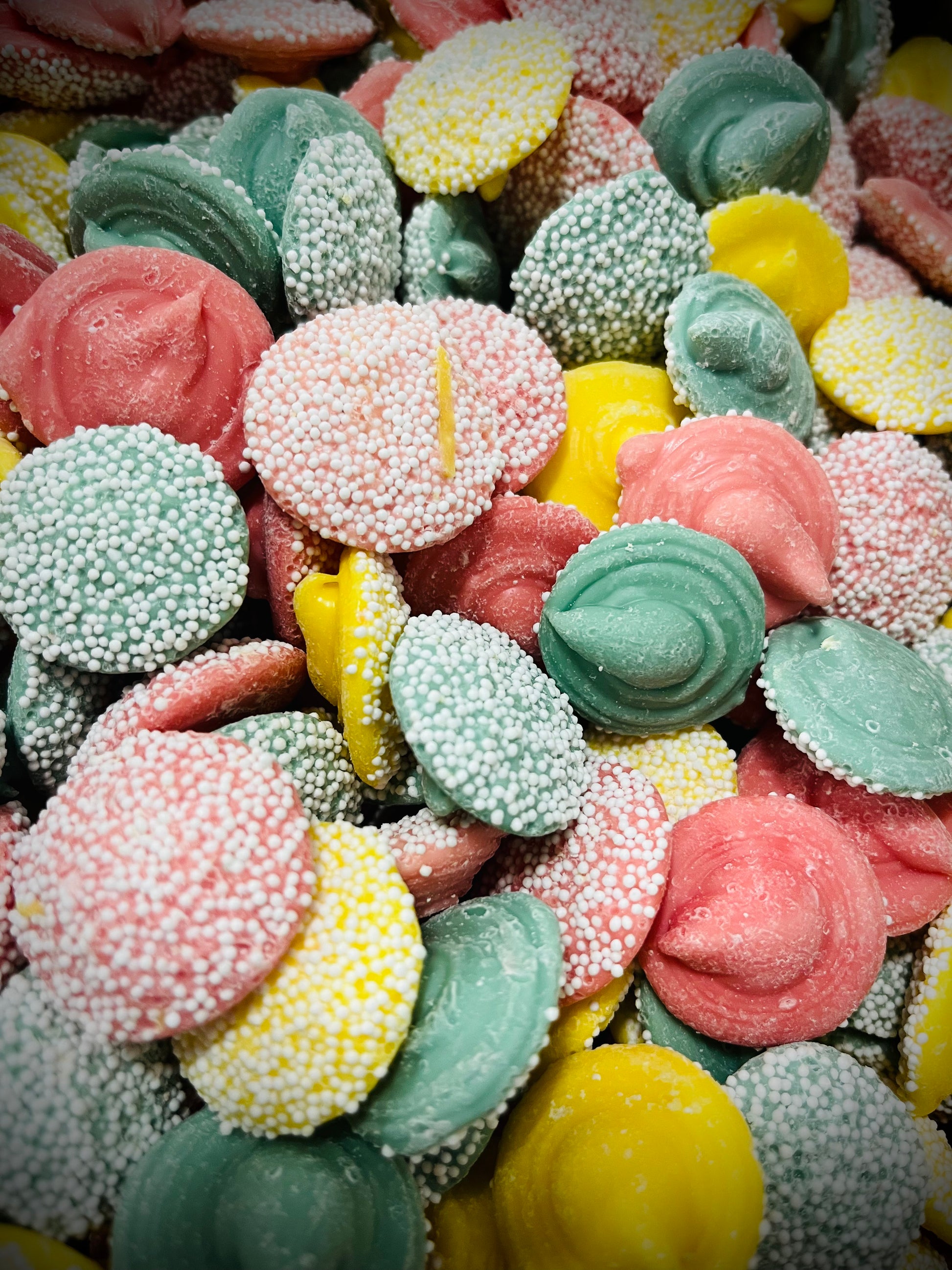 Ingredients: Confectionery Coating (Sugar, Vegetable Oil [Palm Kernel Oil and Hydrogenated Palm Kernel Oil], Whey Powder, Whole Milk Powder, Nonfat Dry Milk, Soy Lecithin [emulsifier], Salt, Artificial Flavor), Nonpareil Seeds (Sugar, Corn Starch, Carnauba Wax), Artificial Colors (Titanium Dioxide, Yellow 5 Lake, Red 40 Lake, Blue 1 Lake, Blue 2 Lake, Soy Lecithin), Peppermint Oil.Contains: Milk, Soy