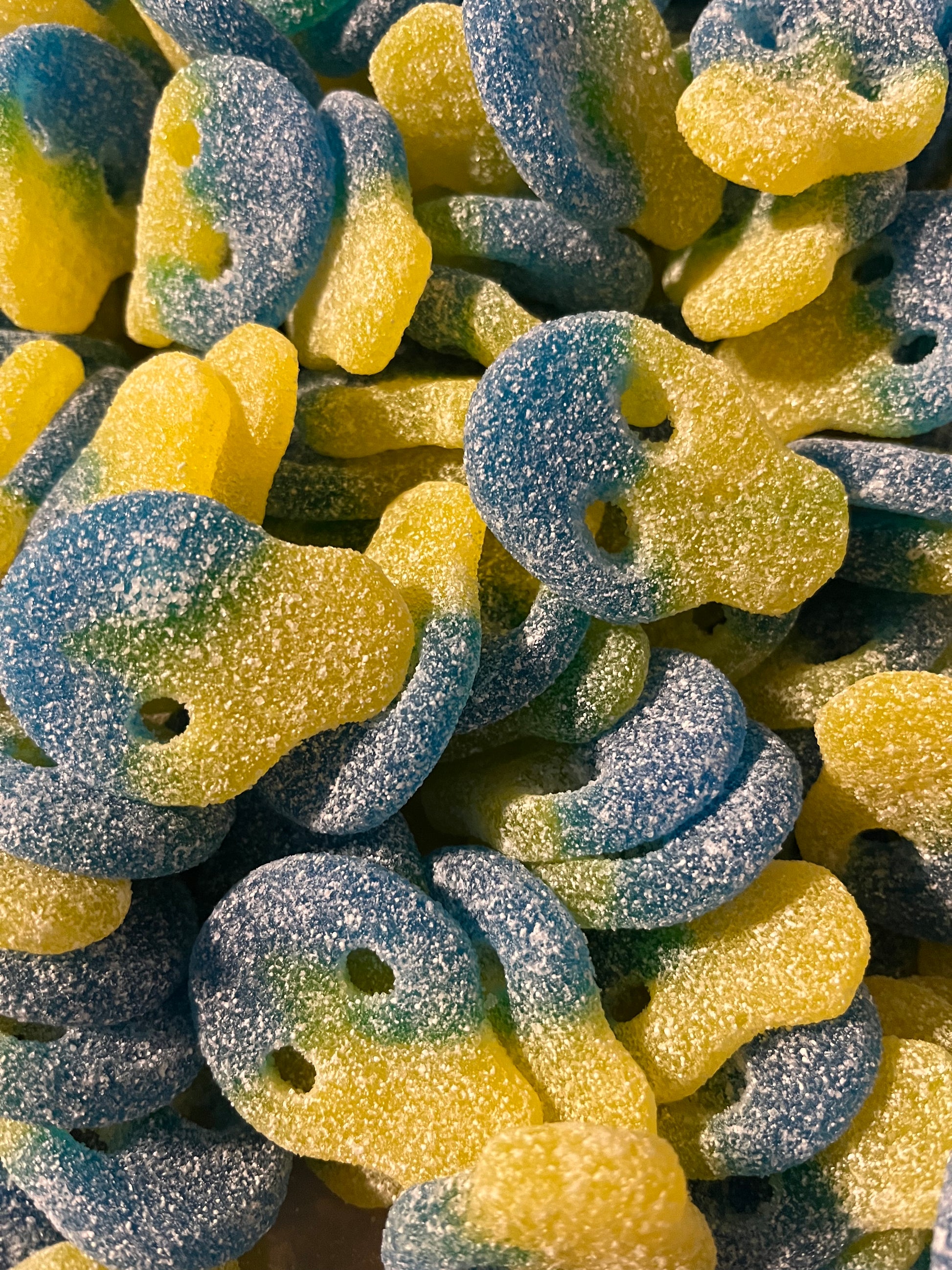 Ingredients: Glucose syrup, sugar, modified starch (Gluten-Free wheat, corn, potato), acidity regulators: citric acid, malic acid, sodium malate, lactic acid, Natural Flavors, Color: caramel, brilliant blue. FD&C Blue 1