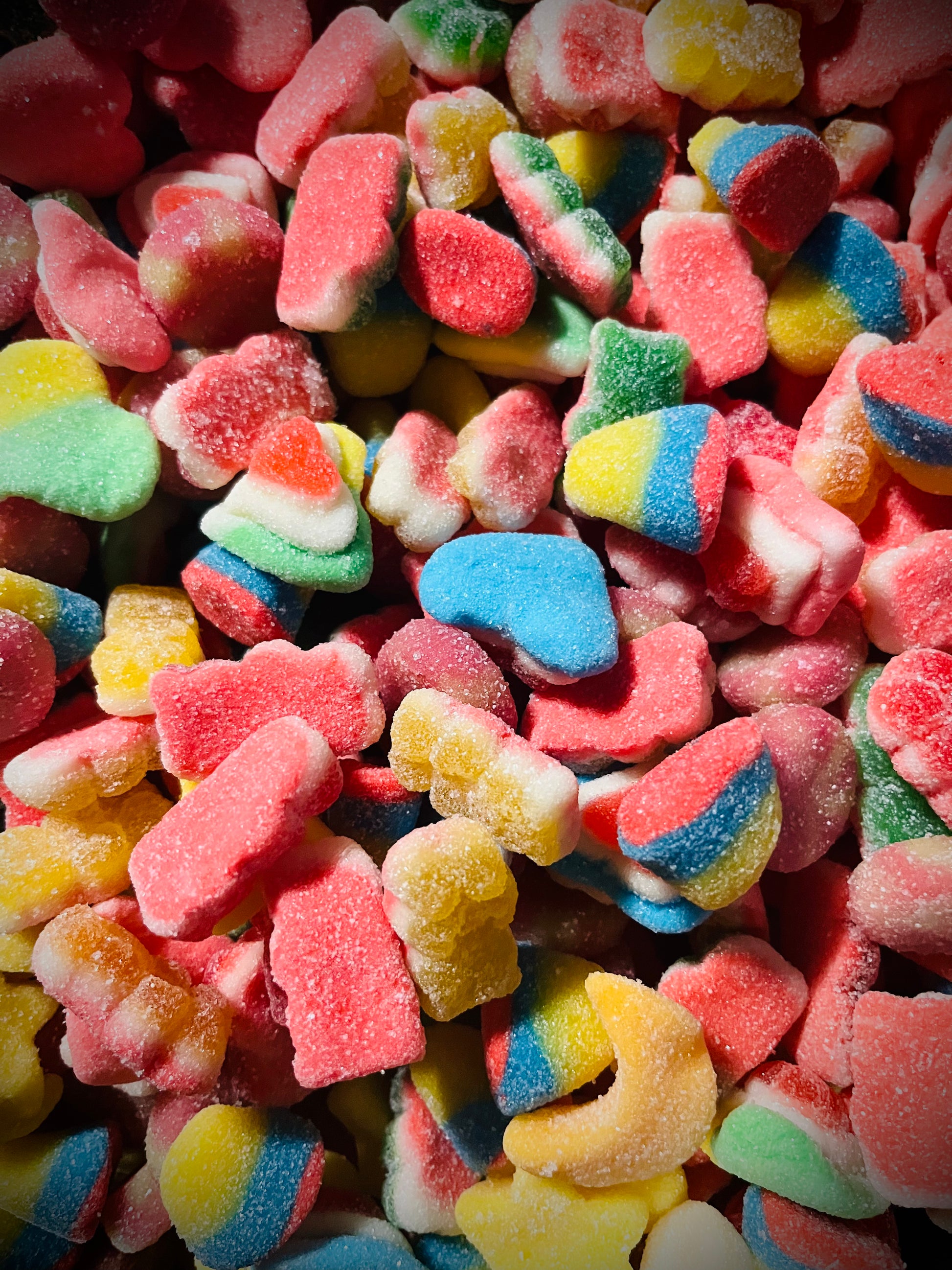 Rainbow Gummy Mix: Triple Layer Bears: corn syrup, sugar, gelatine, humectant, glycerol, modified corn starch, acids, citric acid, malic acid, corn starch, gelling agent, pectins, natural and artificial flavors, color Yellow 5, Yellow 6, Red 40, Blue 1 Tropical Drops: corn syrup, sugar, gelatine, humectant glycerol, modified corn starch, acids, citric acid, malic acid, corn starch, gelling agent, pectins, natural and artificial flavor, color, turmeric, Red 40, Blue 1 Stars and Moons: Corn Syrup, Sugar, Gelatin, Glycerol, Modified Corn Starch, Citric Acid, Malic Acid, Corn Starch, Pectin, Natural and Artificial Flavor, Artificial Colors (Yellow 5, Red 40, Blue 1, Titanium Dioxide).May Contain: Peanuts, Tree Nuts, Milk, Soy, Wheat, Eggs, Sesame. Rainbow Hearts: corn syrup, sugar, gelatin, citric acid, lactic acid, pectin, natural and artificial flavors, artificial colors (Yellow 5, Red 40, Blue 1) Sour Watermelon Lime Bites: corn syrup, sugar, dextrose, potato protein, acids, citric acid, malic acid, acidity regulator, sodium citrates, sodium palates, fruit and vegetable juice for color: spirulina extract for color, turmeric, blackcurrant, carrot, natural and artificial flavor